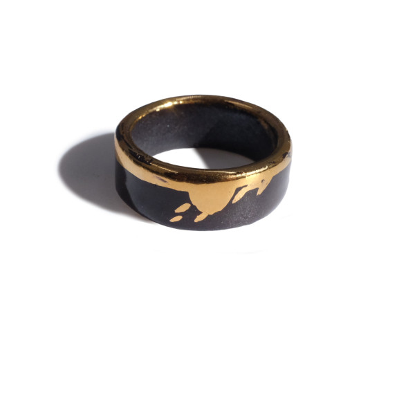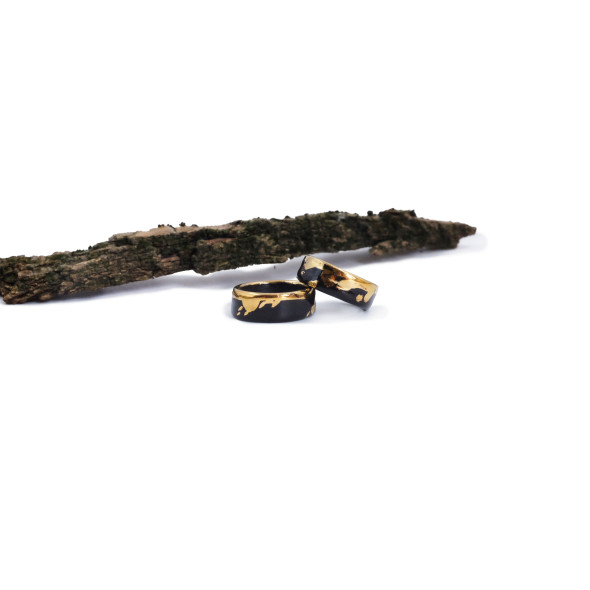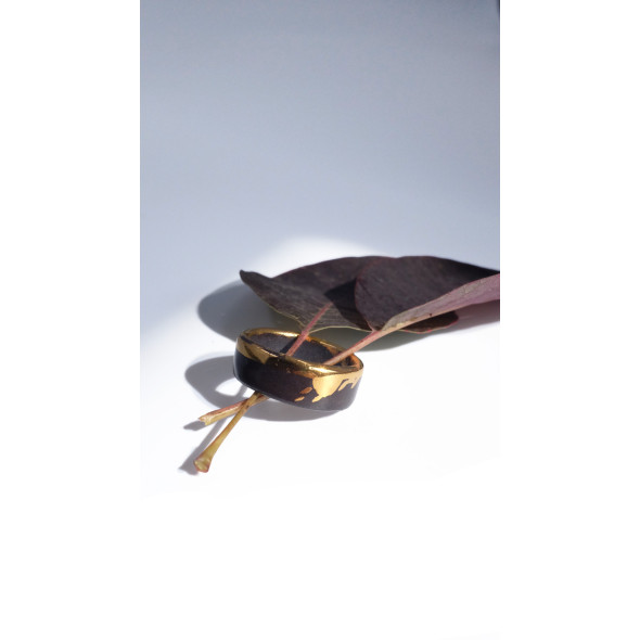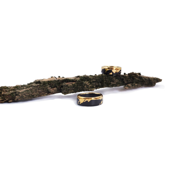 Juodo porceliano galia ir tikro aukso šiluma susilieja į vieną išskirtinį akcentą. Lengvai varvanti aukso juostelė įneša spontaniškos energijos, lyg netikėtas potėpis ant tamsaus, elegantiško paviršiaus. Šis kontrastas tarp juodos paslapties ir aukso švytėjimo suteikia žiedui žaismingumo bei gyvumo. Tai papuošalas, kuris natūraliai dera prie kasdienio stiliaus, tačiau kiekvieną akimirką paverčia ypatinga – subtili elegancija, užrašyta spontaniškame potėpyje.